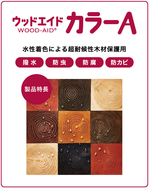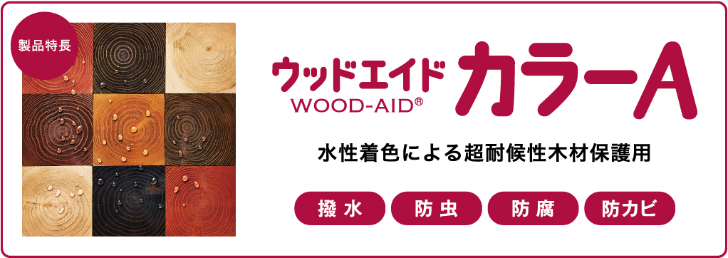シリコーンゴムとアクリルのハイブリッドによって生まれたウッドエイド カラー A。従来の硬い被膜のアクリルシリコーン塗料と異なり、シリコーンゴムの弾性被膜が木材の膨張と収縮を緩和することから、優れた色持ちと耐候性、撥水性、通気性をより長く発揮。さらに防カビ・防虫・防腐性能もプラスした新しいタイプの画期的な水性着色塗料です。水性なので、油性に比べて取り扱いしやすく、安全に木質外壁やエクステリアを着色できます。
