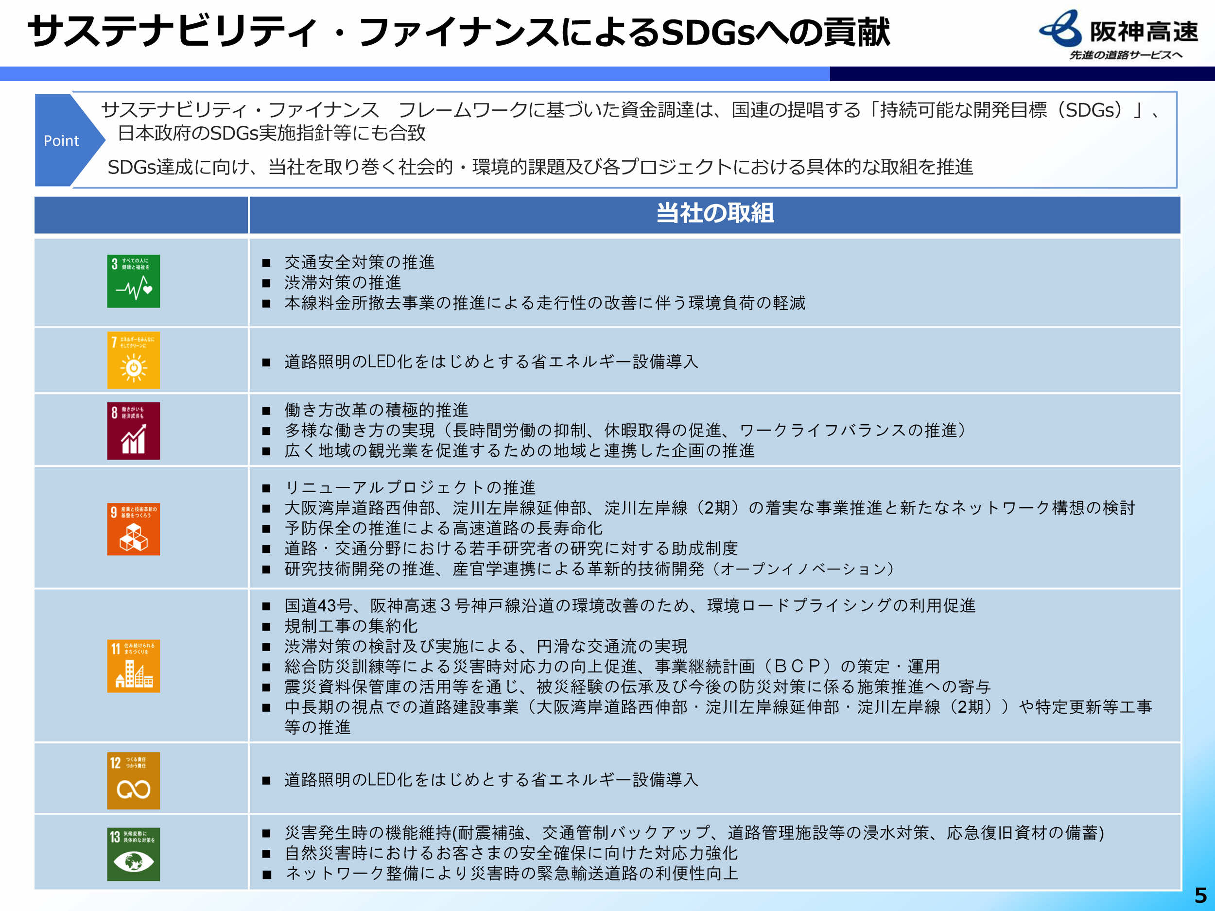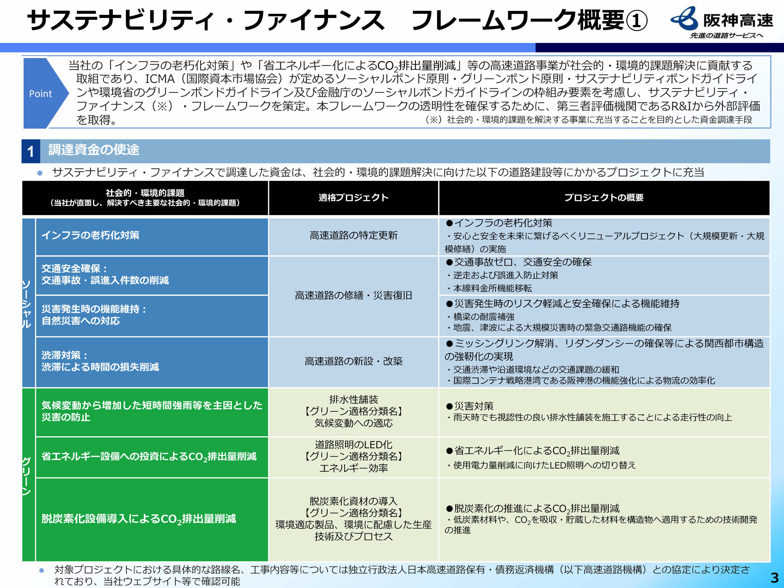 本債券の発行による調達資金は、同社が担う高速道路事業に充当され、「インフラの老朽化対策」、「交通安全確保」、「災害発生時の機能維持」、「渋滞対策」などの社会貢献活動のほか、「排水性舗装の施工」、「道路照明のLED化」、「脱炭素化資材の導入」などの環境貢献活動に活用されます。高速道路事業は、国連の策定する持続可能な開発目標(SDGs)(2)のうち、「目標3:すべての人に健康と福祉を」、「目標7:エネルギーをみんなにそしてクリーンに」、「目標9:産業と技術革新の基盤をつくろう」、「目標11:住み続けられるまちづくりを」、 「目標13:気候変動に具体的な対策を」等の達成にも貢献します。
